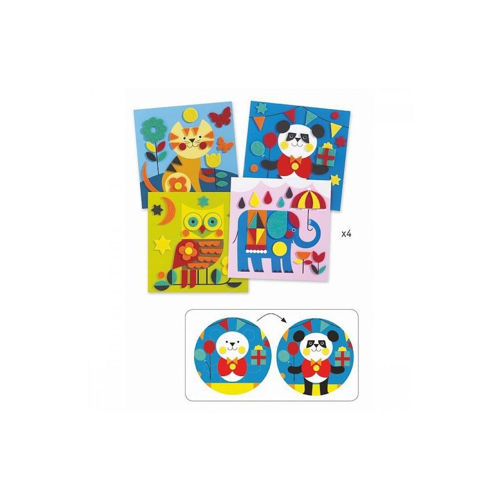 Découvrez les tableaux de feutrine douces créatures de Djeco, une activité de collage avec de la feutrine colorés autocollantes pour les enfants de 3 à 6 ans. Un loisir créatif à réaliser pas à pas avec des pièces de feutrine prédécoupées et autocollantes à utiliser comme des gommettes. 4 jolis ta