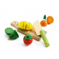 Fruits et légumes en bois à scratch, jeu d'imitation cuisine et découpage, une planche et un couteau. Dès 18 mois Djeco