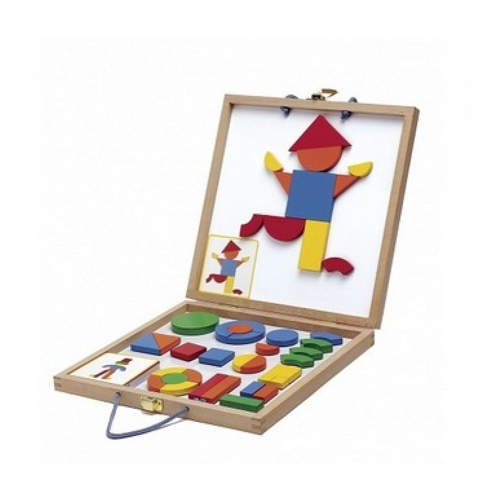 Une boite contenant des pièces en bois magnétiques. Le couvercle devient tableau de jeu. Le grand nombre de formes et de couleurs permet aux enfants de laisser libre cours à leur imagination. - 42 pièces magnétiques en bois. - 24 cartes magnétiques