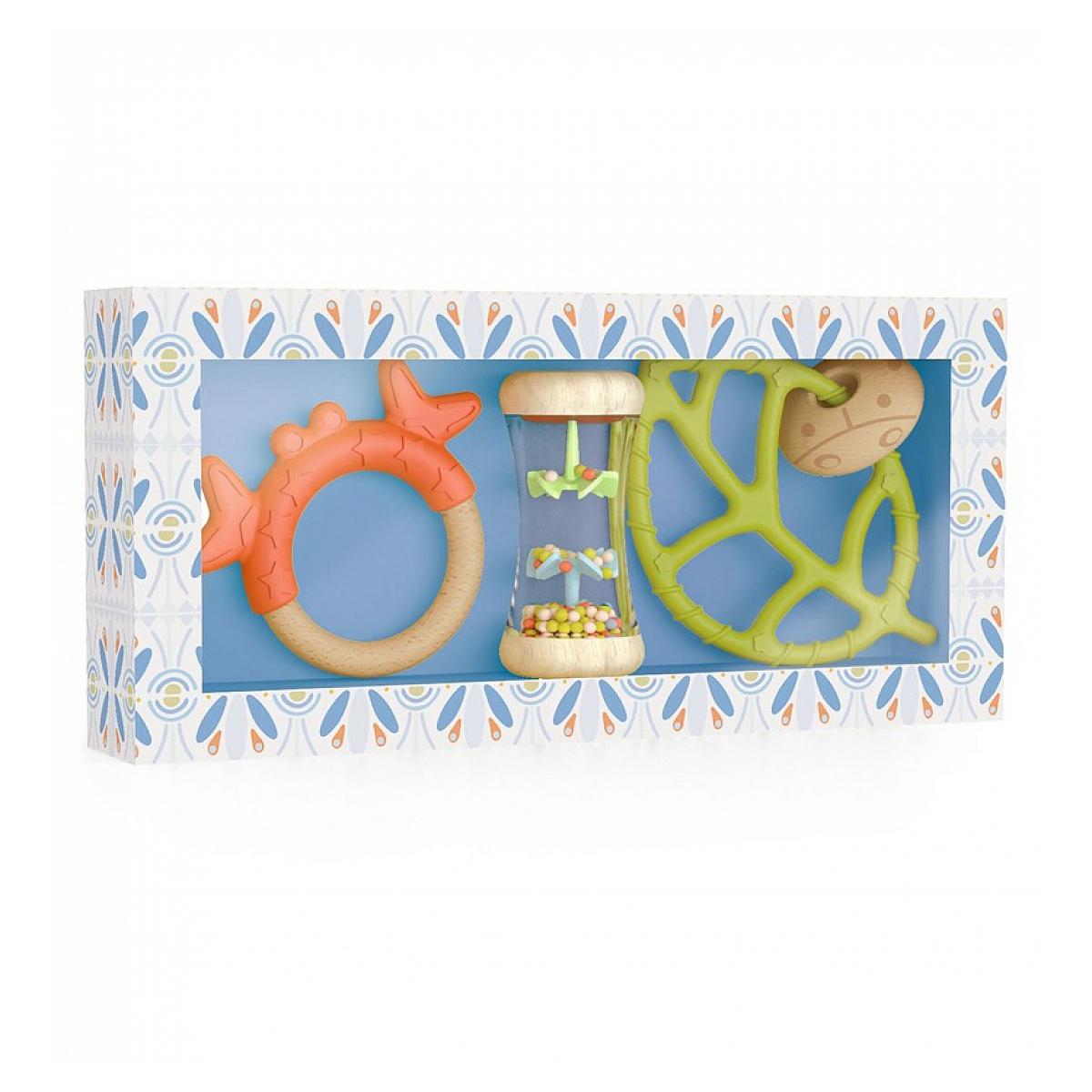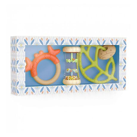 Le coffret de naissance Babyset comporte : un bâton de pluie deux anneaux de dentition en bois et silicone Une jolie idée de cadeeau de naissance pour éveiller le bébé.