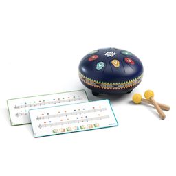 Un magnifique tambour en acier joliment illustré sur le thème amérindien. Cet instrument de musique à percussion a 8 languettes correspondant à 8 notes de musique. Très intuitif et facile à jouer, l'enfant tape sur les languettes avec les baguettes : par ses vibrations, l'instrument émet un son doux