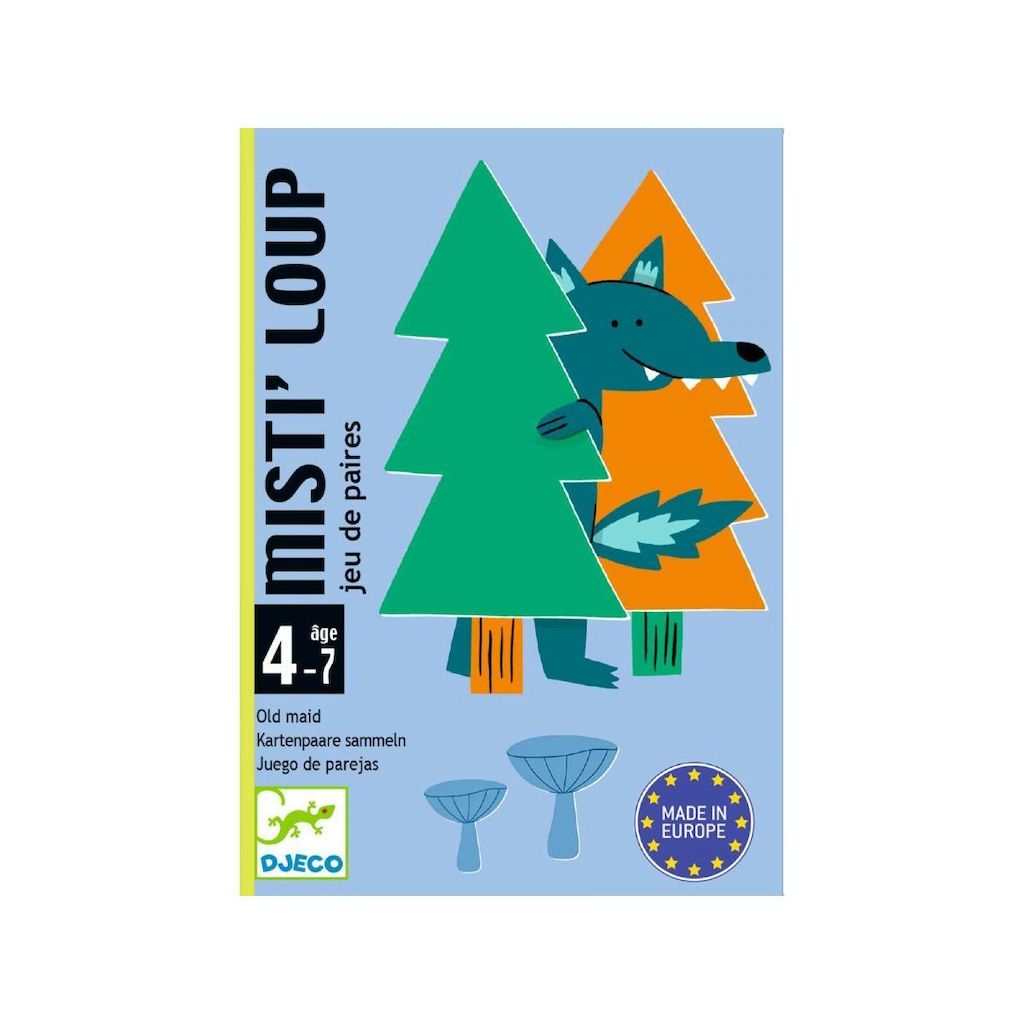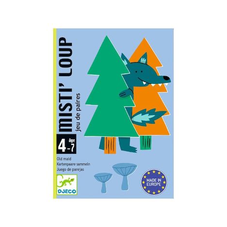 Le jeu d'ambiance Misti'Loup de la marque Djeco est un jeu de cartes amusant pour les enfants, inspiré du altique Mistigri. Ce jeu comprend 33 cartes résistantes en papier et carton certifiés FSC®, avec des dimensions de 10,5 x 7 cm, et une boîte de 11,7 x 8,5 x 2,8 cm. Il est conçu pour 2 à 4 joueu