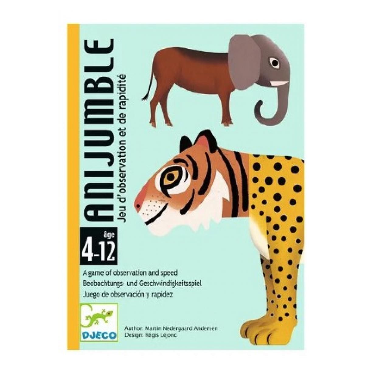 Découvrez le jeu de cartes Anijumble de Djeco, un jeu d'observation et de rapidité pour les enfants de 4 à 12 ans. Quelle pagaille! Un savant fou a créé de drôles de chimères avec la tête d'un animal et le corps d'un autre.. Soyez le plus rapide à reconstituer de vrais animaux. Un jeu de société amu