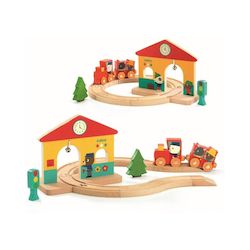 Jeu d'imagination et de manipulation. Un petit circuit de rails et 2 wagons en bois qui roulent.