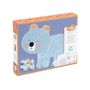 Une première activité de peinture dès 18 mois. L'adulte détache les formes et met de la peinture dessus. Au tour de l'enfant de mettre ses mains dans la peinture et de badigeonner les formes : on dit qu'il patouille ! Il assemble ensuite les formes et colle des autocollants. Il crée 4 animaux vraiment jolis en 2D.