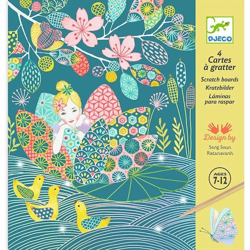 Une activité manuelle comprenant 4 cartes à gratter aux reflets irisés pour une douce balade pleine de surprises au fil de l'eau. En suivant le livret d'instructions, l'enfant reproduit les motifs imaginés par l'artiste en grattant la surface de la carte à l'aide du stylet en bois.