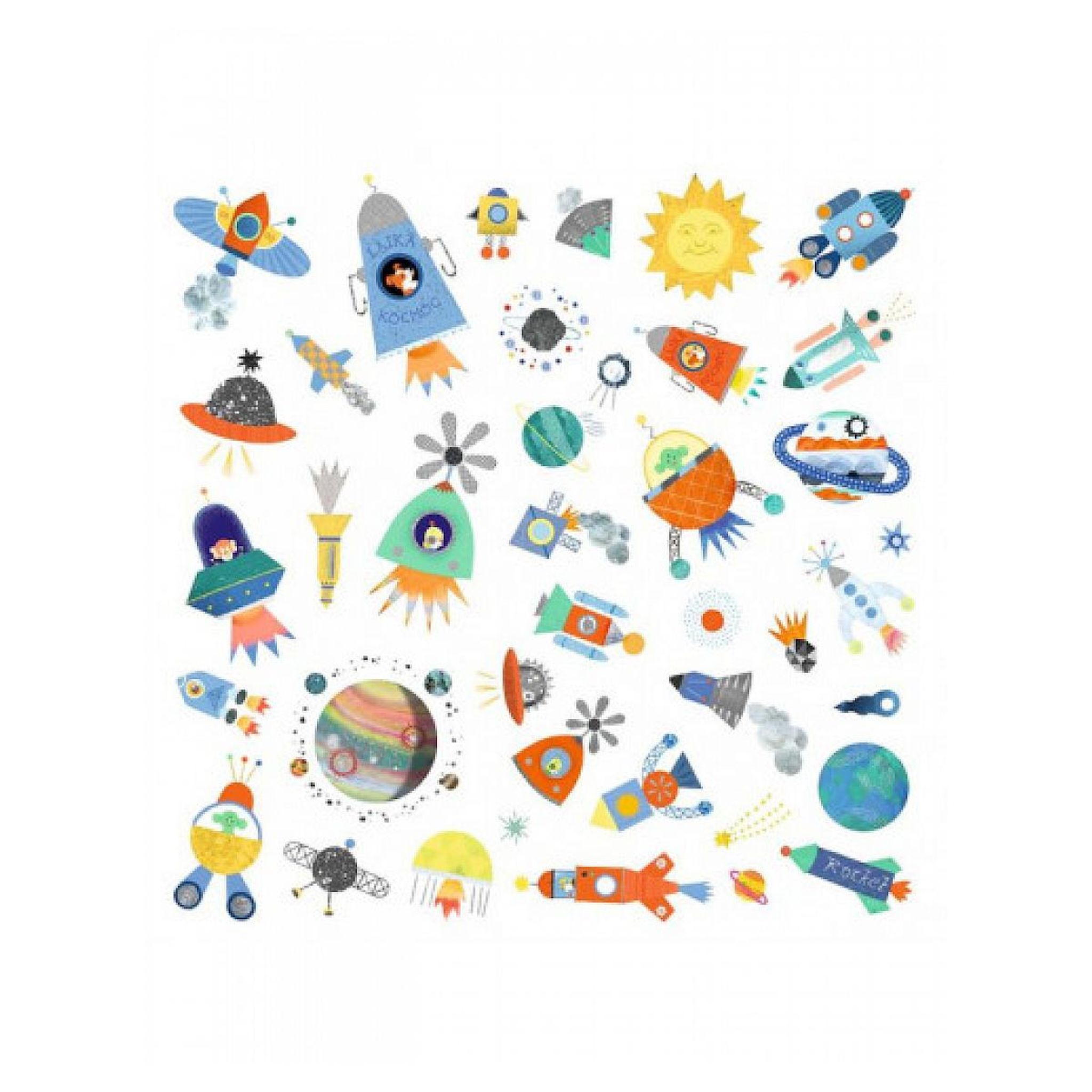 une pochette comprenant 4 planches avec 160 stickers sur le thème de l'espace. Astronautes, fusées, planètes, étoiles.. votre enfant s'amusera à coller ces superbes stickers partout pour créer de jolies scènes. Vous en retrouverez sur ses cahiers, ses dessins.. et parfois où il ne faut pas! Dimensio