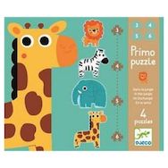 Coffret de 4 Primo Puzzle thème Jungle avec 3/4/5/6 pièces. Une façon pour bébé d'évoluer à son rythme dans le monde merveilleux du puzzle. Chaque puzzle est en forme d'animal: Lion, Zèbre, Elephant, Girafe. Dès 2 ans.