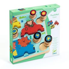 Puzz et Roll est un jeu 2 en 1 : un puzzle en bois et un jouet qui roule. L'enfant assemble les roues à l'animal de la même couleur et les fait rouler. Il jouera ensuite à tout replacer sur le socle puis recommencer !