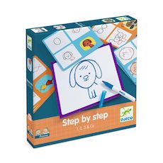 Apprendre à dessiner en suivant le pas-à-pas. Des cartes « modèle » pour guider l'enfant. Il recommence autant de fois qu'il le souhaite avec le feutre effaçable. Une première approche ludique et facile de la symétrie axiale.