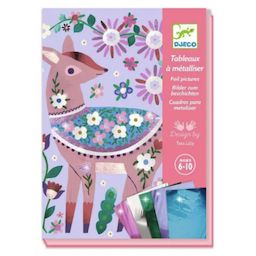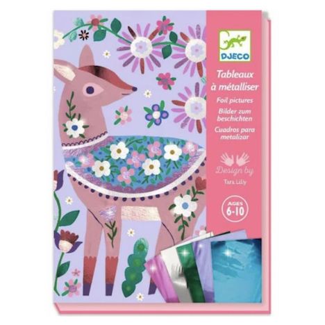 4 magnifiques tableaux sur le thème des animaux de la forêt. Votre enfant s'amusera à décorer d'adorables animaux avec des feuilles métallisées. Grâce au code couleurs indiqué sur les planches, il pourra repérer facilement les zones à métalliser. À l'aide de l'outil, il ôte la pellicule protégeant la surface encollée, puis y dépose la feuille métallisée. La matière se dépose comme par magie et les tableaux s'illuminent. Ce coffret comprend 4 cartes illustrées et préencollées, 15 feuilles de métal à déposer, 1 outil pour dévoiler les surfaces encollées et 1 livret d'explications pas à pas en couleurs.