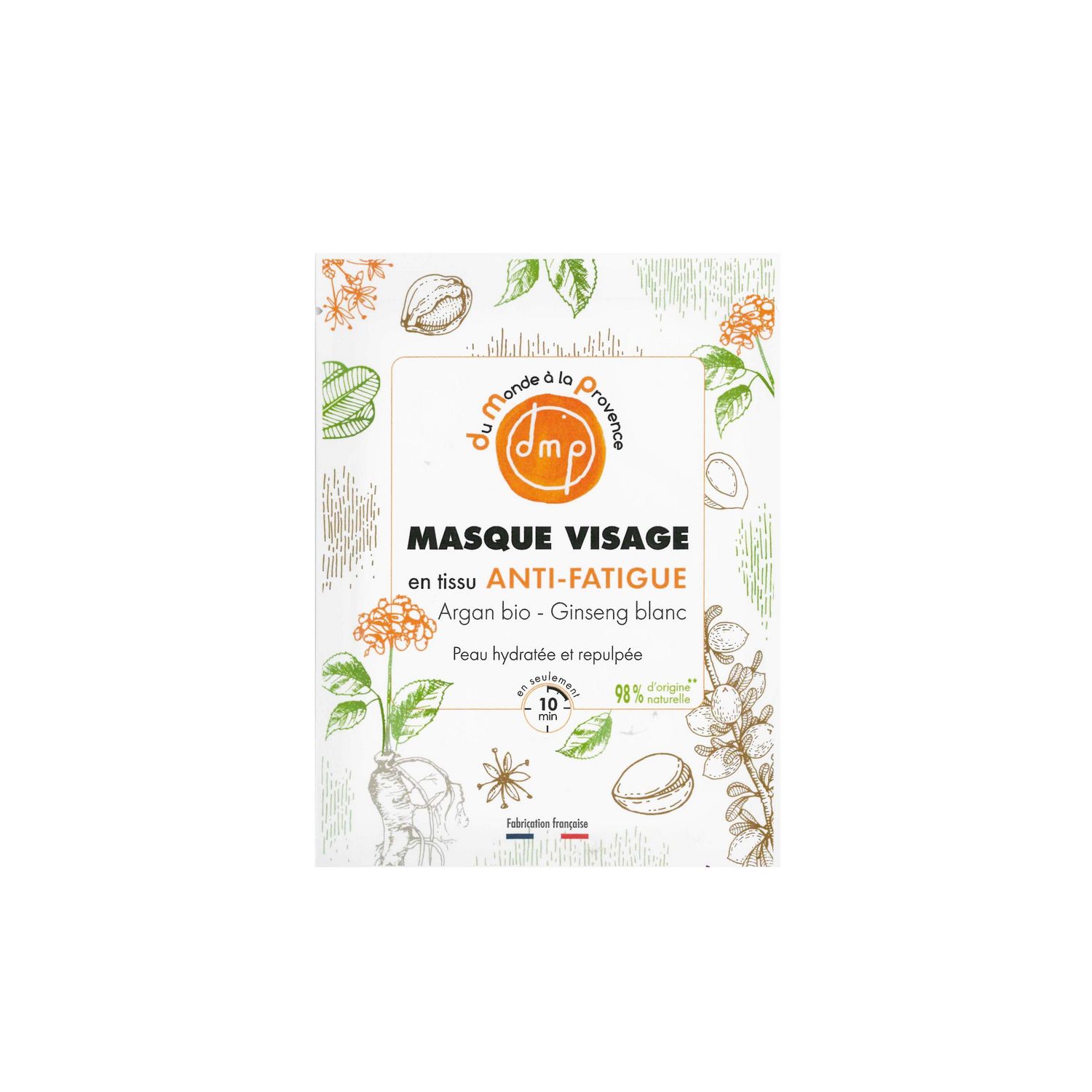 Profitez des bienfaits du masque en tissu Du Monde à la Provence qui aide à tonifier votre peau. Un véritable shot d’énergie grâce à l’huile d’Argan biologique et à l’Extrait de Ginseng blanc qui atténue les signes de fatigue accumulée. Comme une sieste, votre soin 10 minutes repose votre peau.