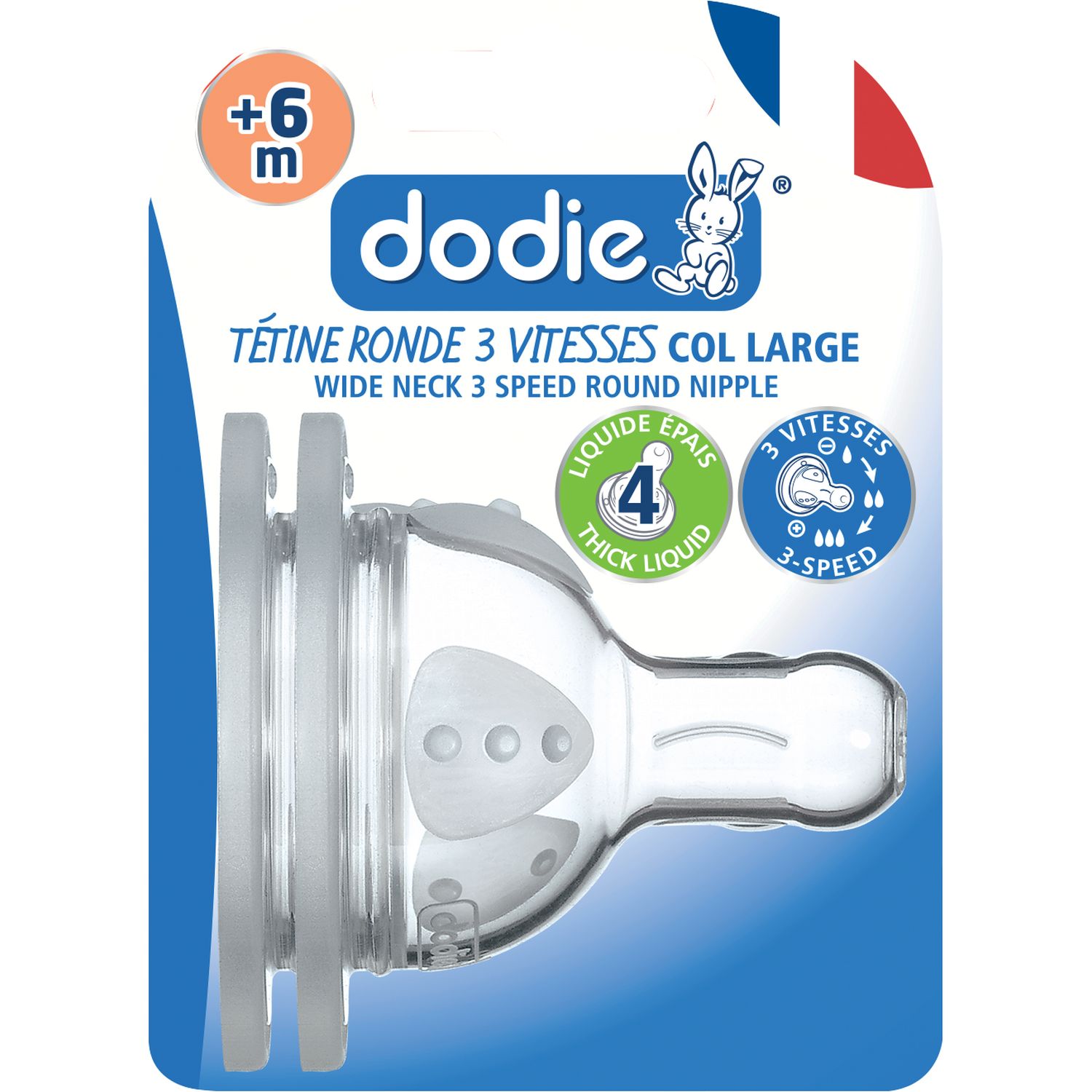 -Système anti-colique breveté intégré dans la tétine -3 vitesses, adaptée au rythme de succion de bébé -Bout rond adapté à la bouche de bébé -Stries pour éviter le collage des parois pendant la succion -Silicone extra-souple pour une tétée sans se fatiguer -Adoptée par 9 bébés sur 10 Tétine Initiation+ ronde 3 vitesses col large +6 mois silicone débit 4