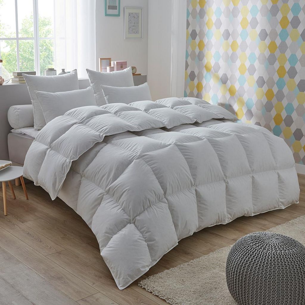 Cette couette duvet tempérée composée à 50% de duvet de canard et bénéficie d'une enveloppe en percale de coton qui assure confort et douceur pendant longtemps.