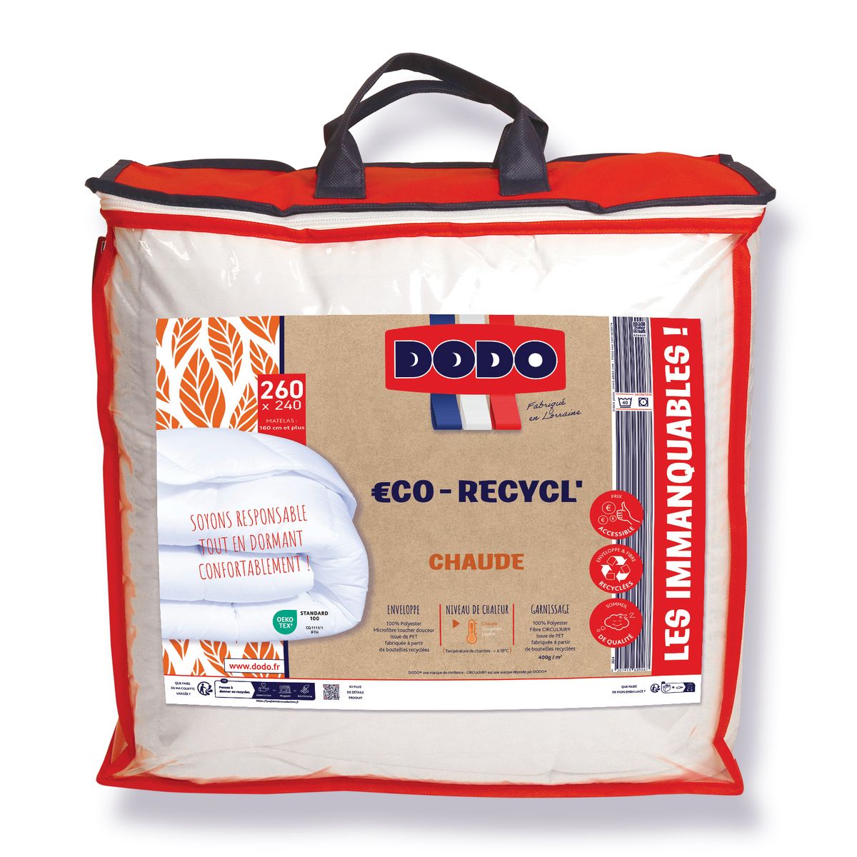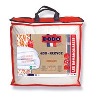 Couette DODO Chaude €CO-RECYCL' - Coloris : Blanc -Enveloppe : 100 Polyester Microfibre Recyclée issu de PET et fabriquée à partir de bouteilles recyclées - Garnissage : 100% Polyester CIRCUL'AIR - Fibre Creuse Siliconée Recyclée issue de PET et fabriquée à partir de bouteilles recyclées - Densité de Garnissage : 400 g/m² - Piquage : Longitudinal - Finition : Biais Uni Blanc - Double Piqûre de Renfort - Housse DODOBOX PEVA/Intissé de Coloris Rouge à Poignée avec Zip + 1 Encart