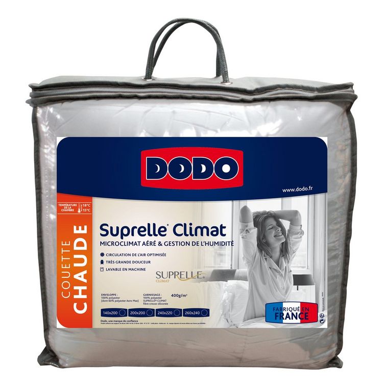 La Couette DODO Suprelle Climat est confectionnée dans une enveloppe AERO MAX Respirante. La fibre de garnissage SUPRELLE CLIMAT optimise la circulation de l'air, crée un micro-climat aéré et une parfaite gestion de l'humidité. Couette Chaude, idéale pour des Chambres chauffées entre 15° et 18°C. Fa