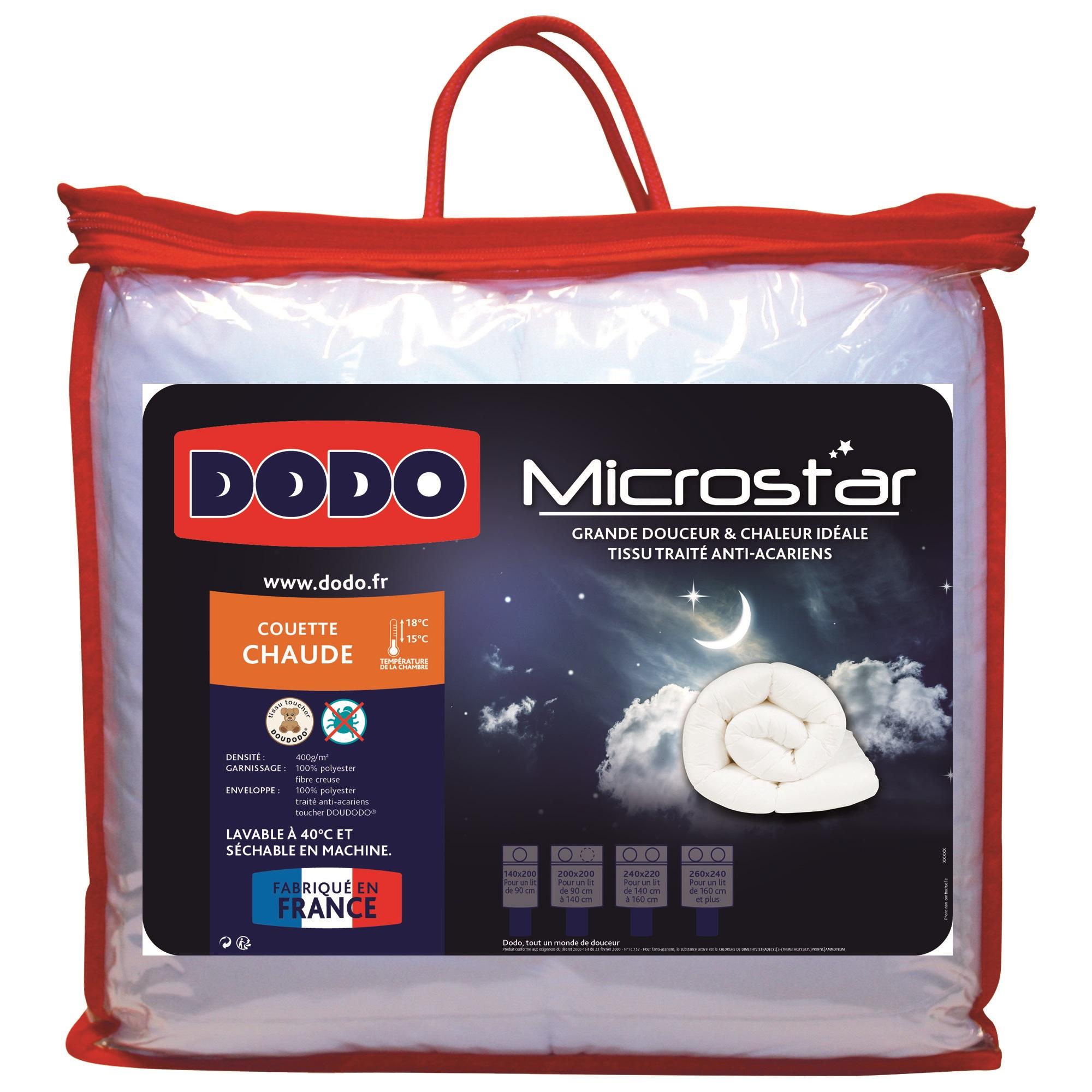 La Couette DODO MICROSTAR est confectionnée dans un Tissu Ultra Doux, Toucher DOUDODO®, Traité Anti-Acariens et avec une Fibre de Garnissage 100% Polyester, Creuse, permettant une bonne Circulation de l'Air. Couette fabriquée en France, elle est tout simplement Douce et Chaude à la Fois. Elle vous permettra également de dormir dans un Environnement plus Sain, grâce à son Traitement Anti-Acariens.
