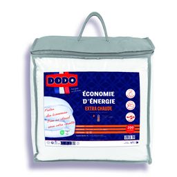 Couette DODO Extra chaude ÉCONOMIE D'ÉNERGIE - Coloris : blanc - Enveloppe : 100% Polyester - Garnissage : 100% Polyester VOLUPT'AIR - Fibre creuse siliconée - Poids de Garnissage : 500 g/m² - Piquage : longitudinal - Emballage : Housse PEVA à poignée + 1 encart