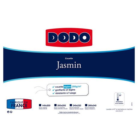 La Couette DODO Légère Jasmin est confectionnée dans une enveloppe Polyester/Coton Haut de Gamme, pour un confort Idéal. Son garnissage en fibre 100% Polyester, Creuse, permet une bonne Circulation de l'Air . Couette légère pour l'Été où le Printemps, ou les chambres surchauffées. Fabrication Française, qualité garantie.
