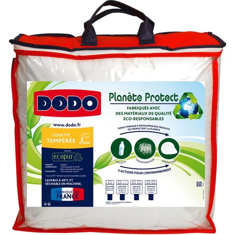 DODO s'engage à développer des produits qui respectent la Planète ! 3 actions pour l'environnement : collecte + transformation + production La couette DODO tempérée Planète Protect est fabriquée avec des matériaux de qualité Éco-responsable : son enveloppe est confectionnée avec un tissu recyclé, so