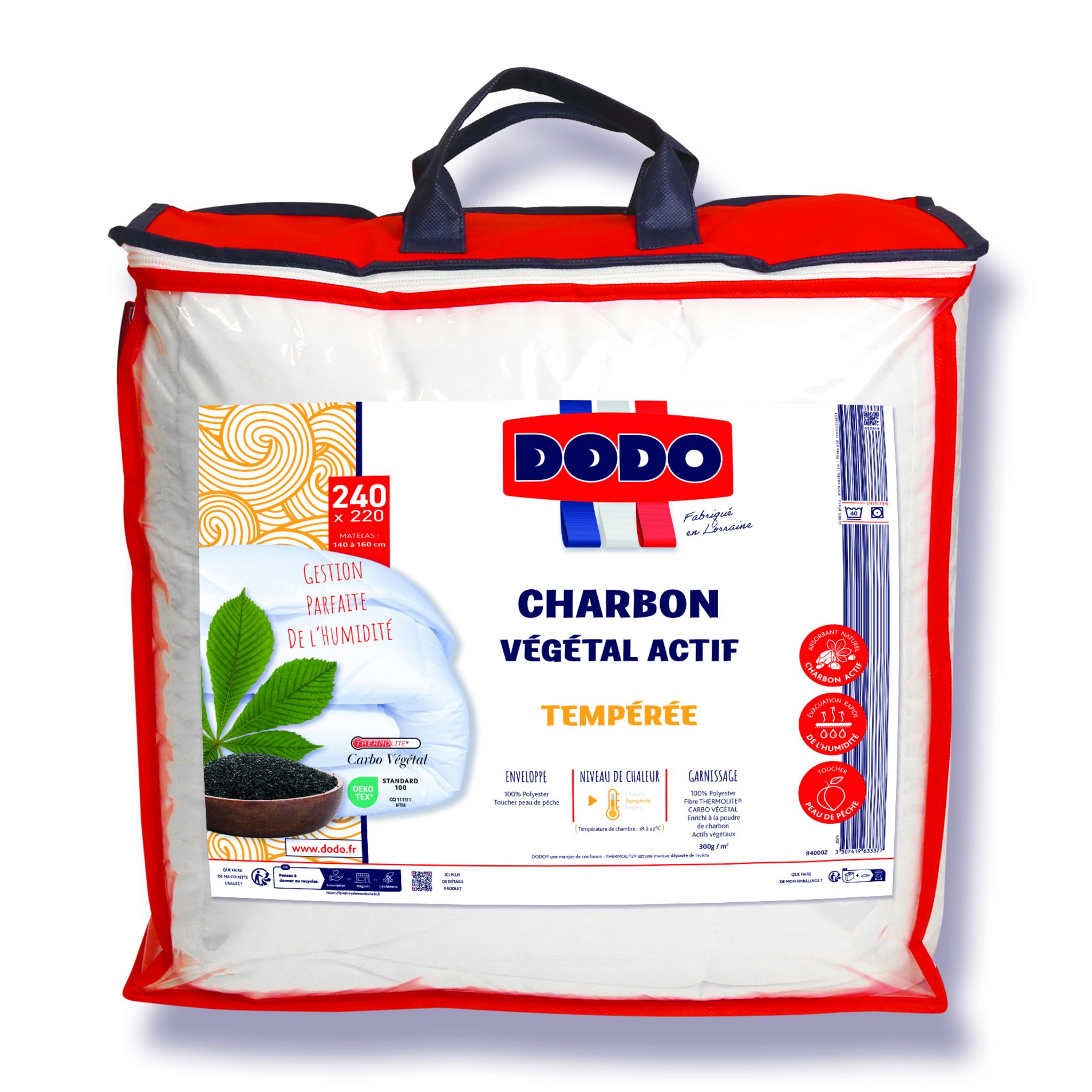 Couette DODO Tempérée CHARBON VEGETAL ACTIF - Coloris : blanc - Enveloppe : 100% Polyester Toucher Peau de Pêche - Garnissage : 100% Polyester THERMOLITE CARBO VÉGÉTAL - Fibre creuse siliconée enrichie à la poudre de charbon - Actifs végétaux - Poids de Garnissage : 300 g/m² - Piquage : vague - Emballage : Housse PEVA/Intissé de coloris rouge à poignée + 1 encart