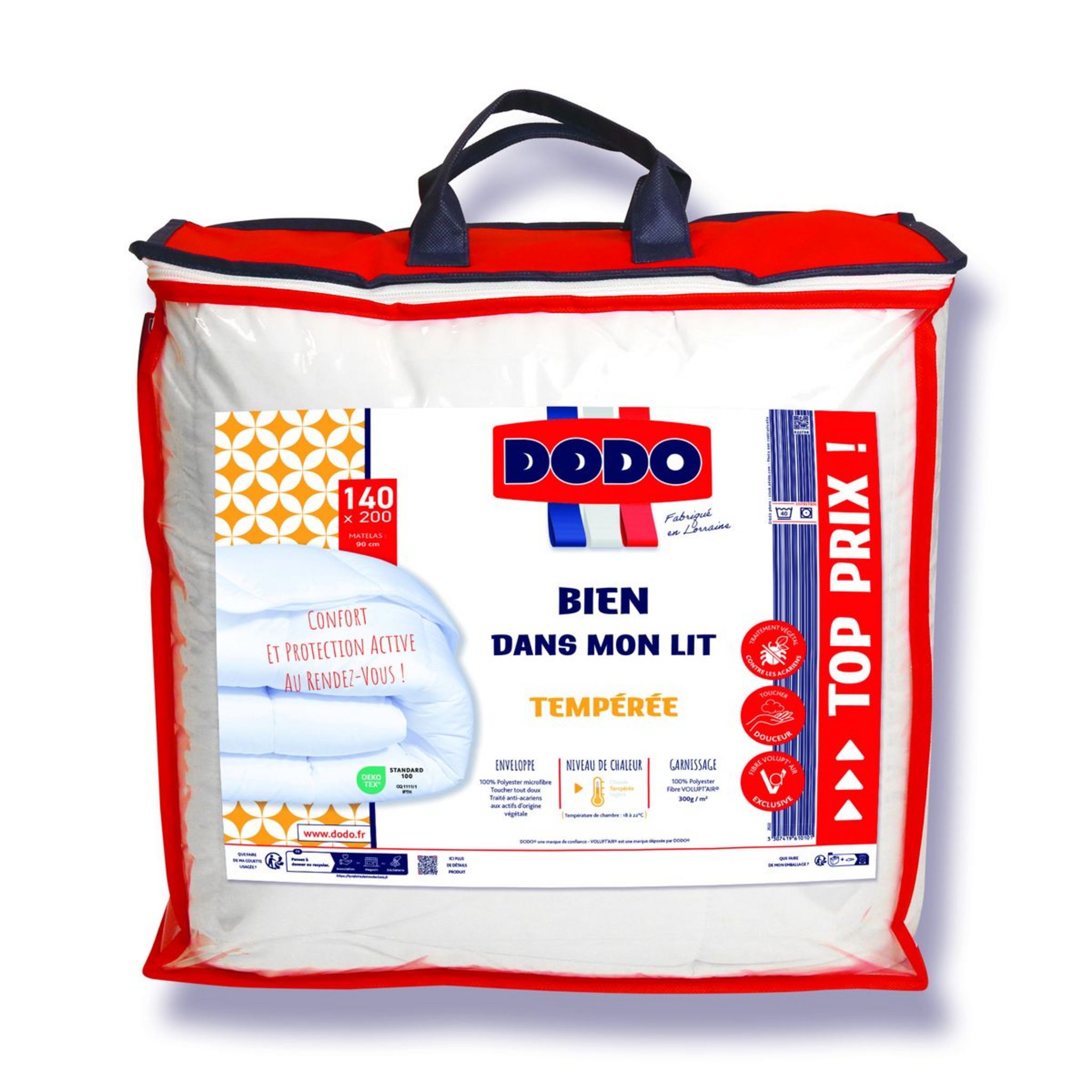 Confectionnée avec un Tissu 100% Polyester Microfibre Très Doux - Peau de Pêche Traité Anti Acariens aux Actifs d'Origine Végétale (Traitement Fabriqué en France), pour une Protection Sûre et Saine. Garnie de Fibre 100% Polyester VOLUPT'AIR® exclusive à DODO, Douce et Aérée. Bien dans mon Lit, Bien dans ma Vie ! Tempérée, pour un Usage tout au long de l'Année. Fabrication Française, Qualité Garantie.