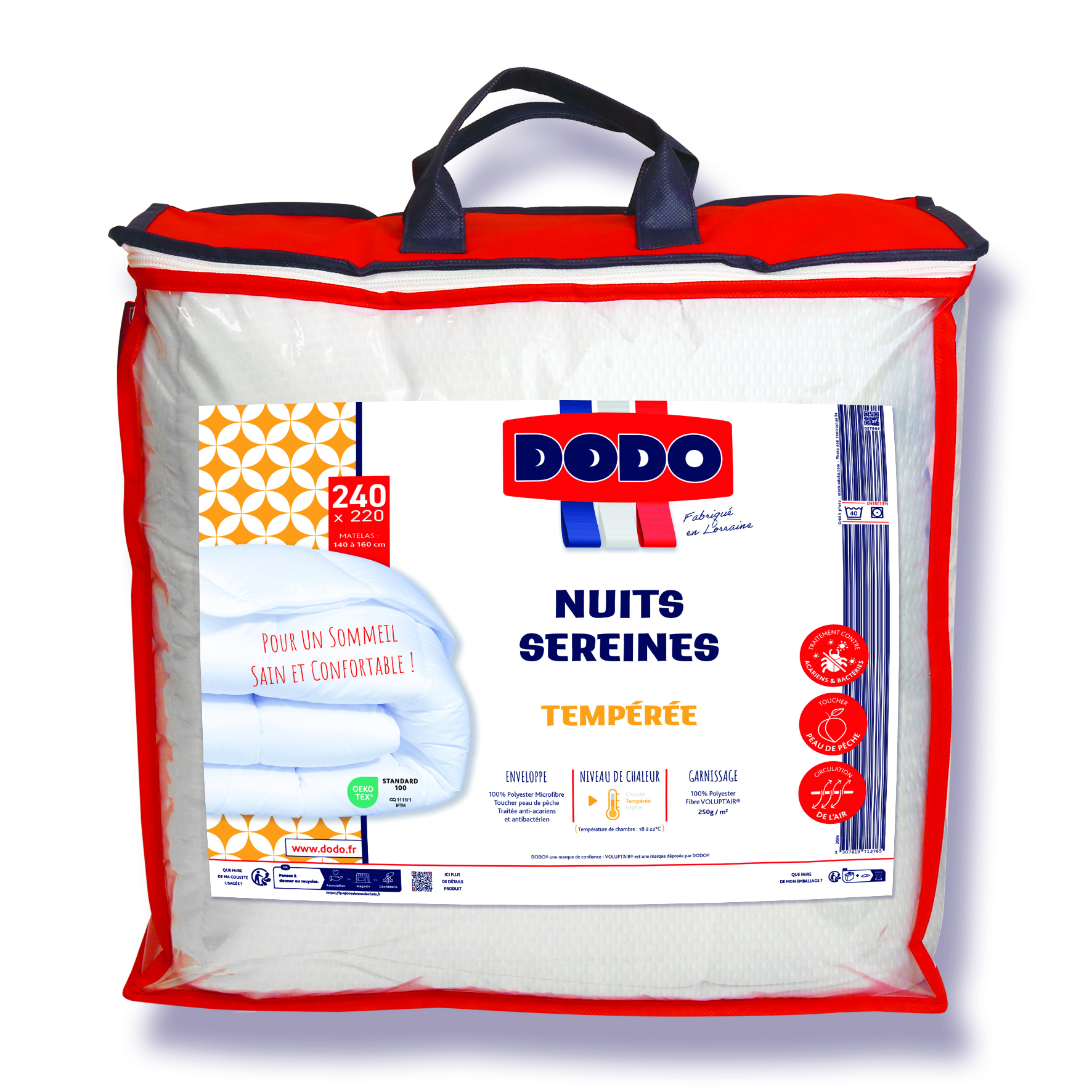 Enveloppe : 100% Polyester Tissu Microfibre Toucher peau de pêche traité Anti-acariens et Antibactérien - Garnissage : 100% Polyester VOLUPT'AIR - Fibre Creuse Siliconée - Densité de Garnissage : 250 g/m² - Piquage : Longitudinal - Finition : Biais Uni Blanc - Double Piqûre de Renfort - Housse DODOBOX PEVA/Intissé de Coloris Rouge à Poignée avec Zip + 1 Encart