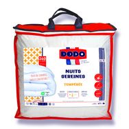 Couette DODO Tempérée NUITS SEREINES - Coloris : Blanc - Enveloppe : 100% Polyester Tissu Microfibre Toucher peau de pêche traité Anti-acariens et Antibactérien - Garnissage : 100% Polyester VOLUPT'AIR - Fibre Creuse Siliconée - Densité de Garnissage : 250 g/m² - Piquage : Longitudinal - Finition : Biais Uni Blanc - Double Piqûre de Renfort - Housse DODOBOX PEVA/Intissé de Coloris Rouge à Poignée avec Zip + 1 Encart