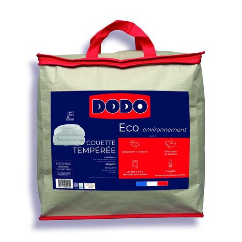 La Couette DODO Éco environnement est fabriquée avec des matériaux qui préservent l'Environnement. Le tissu ainsi que la fibre de garnissage sont issus du recyclage de bouteilles PET. La Housse d'Emballage recyclable est développée et confectionnée avec des Matériaux à Base de Cellulose de Bois. Couette tempérée, pouvant être utilisée tout au Long de l'Année. Fabrication Française, qualité garantie.