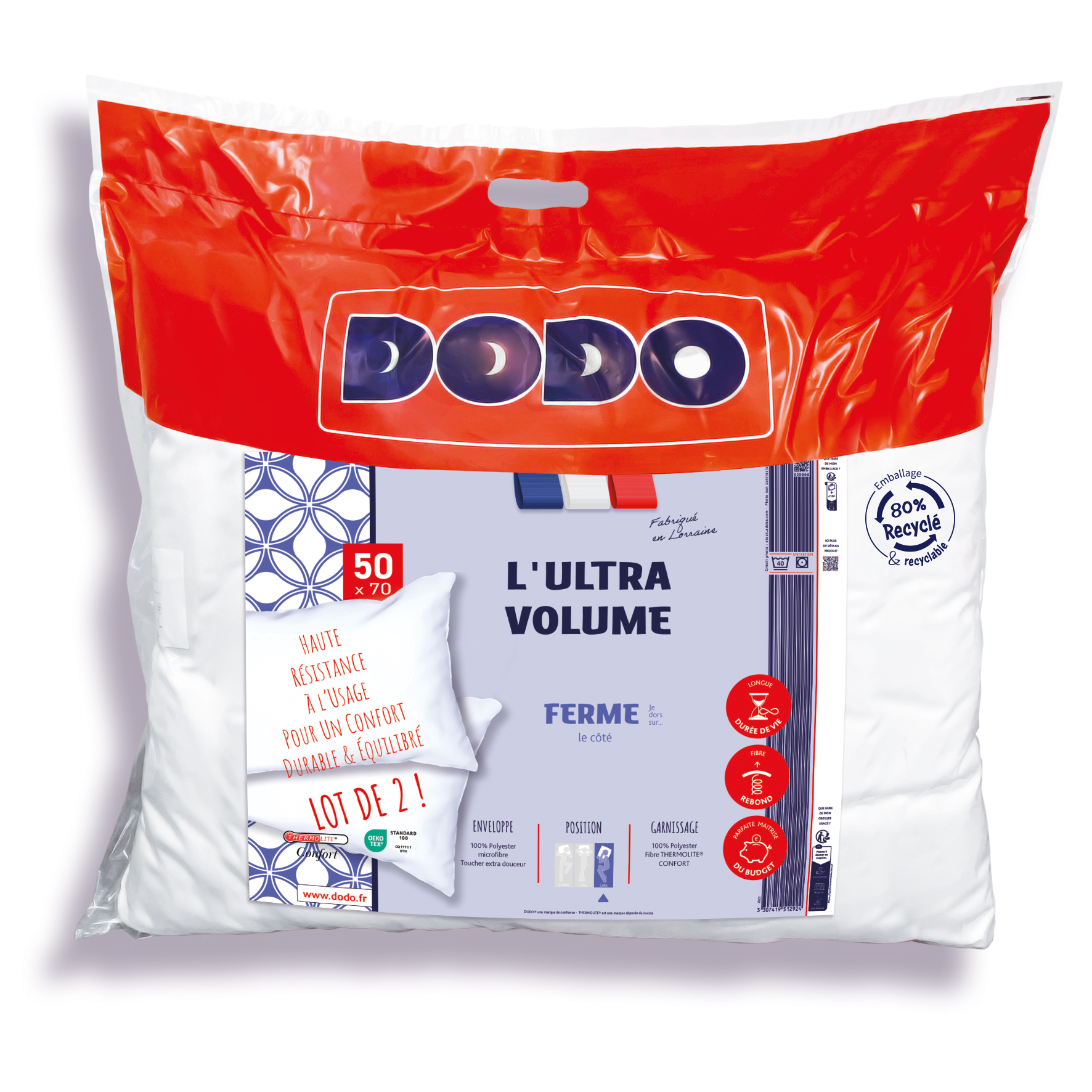 Lot de 2 Oreillers DODO L'ultra Volume est confectionné dans une enveloppe au toucher extra douceur, pour des nuits toutes douces. La fibre Thermolite Confort apporte à vos oreillers un "Ultra Volume" et un confort longue durée. Elle est creuse permettant une bonne Circulation de l'Air et également siliconée pour encore plus de douceur. Oreillers résistant à l'usage, pour un confort longue durée. achetez lot de 2 = achetez malin ! Fabrication Française, qualité garantie.