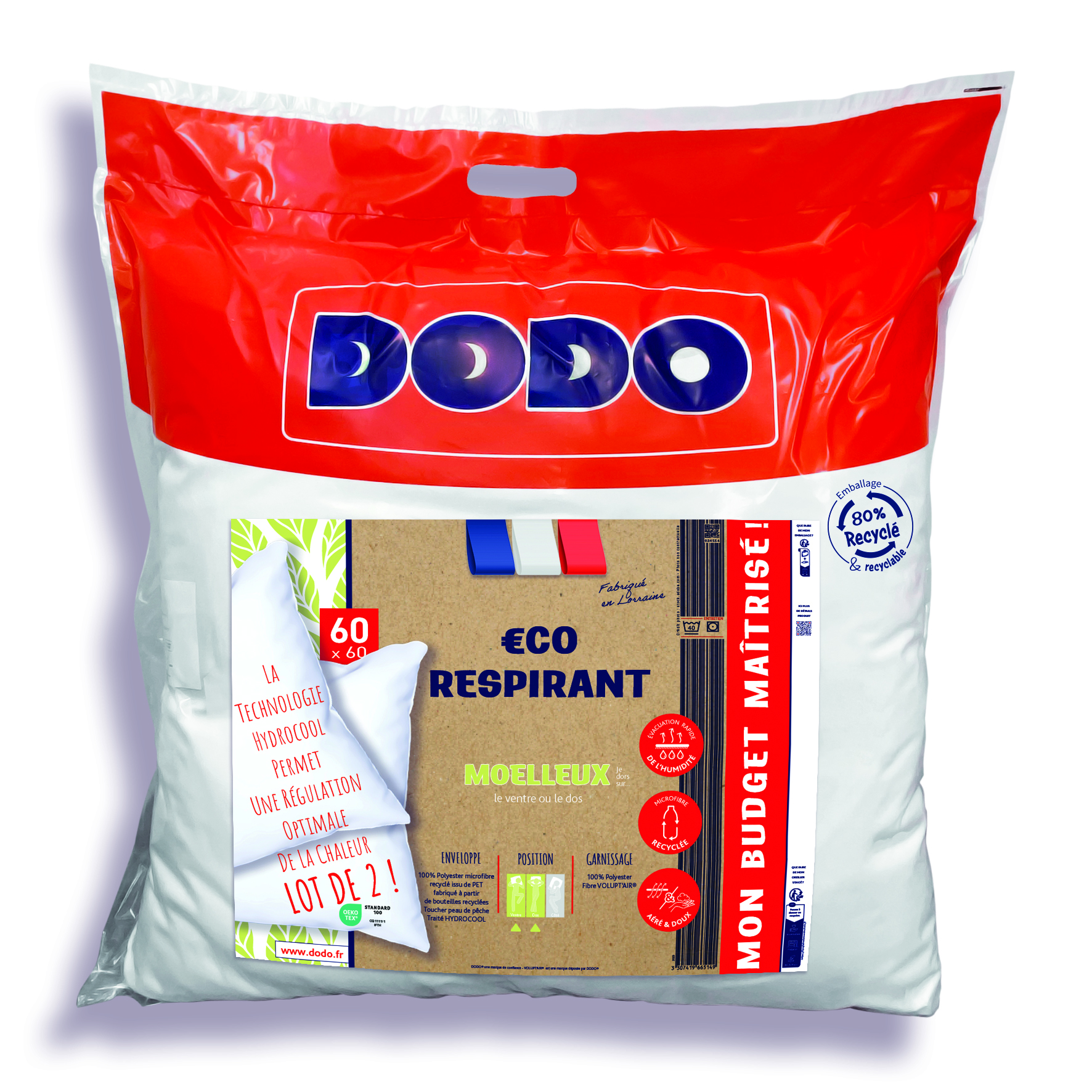 LOT de 2 Oreillers DODO Moelleux €CO-RESPIRANT - MON BUDGET MAÎTRISÉ ! - Coloris : Blanc - Enveloppe : 100% Polyester Microfibre 72 g/m² Recyclée, Certifiée GRS - Issue de PET et Fabriquée à partir de Bouteilles Recyclées et Traitée HYDROCOOL - Garnissage : 100% Polyester VOLUPT'AIR - Fibre Creuse Siliconée Certifiée GRS - Poids de Garnissage : 450 g (par Oreiller, 50/70 et 60/60) - Taille : Finie et non Coupée - Housse Polyéthylène 80% Matière Recyclée Bandeau Rouge DODO + 1 Encart (Article Compressé)