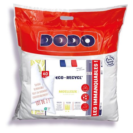 Oreillers confectionnés avec un tissu 100% Polyester Microfibre recyclée toute douce – Peau de pêche et garnis de fibre recyclée 100% Polyester CIRCUL’AIR exclusive à DODO, des composants issus de bouteilles recyclées, l’achat responsable, le confort et l’offre accessible en plus ! Oreillers Moelleux pour ceux qui dorment sur le ventre et/ou le dos. Fabrication Française, qualité garantie.