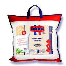Oreiller DODO Médium SERENITY CHANVRE - Coloris : Blanc - Enveloppe : 100% Polyester Tissu Microfibre 83 g/m² - Toucher tout Doux Traité Anti-Acariens aux Actifs d’Origine Végétale - Garnissage : THERMOLITE DRY'CONFORT - 90% Polyester (Fibre Creuse Siliconée) Issu de PET, Fabriqué à partir de Bouteilles Recyclées - 10% Chanvre - Poids de Garnissage : 550 g