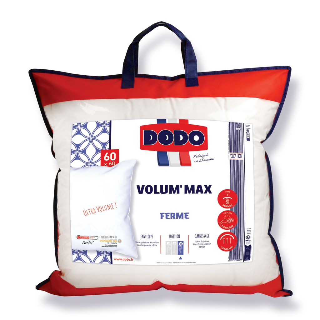 Oreiller DODO Ferme VOLUM'MAX - Coloris : Blanc - Enveloppe : 100% Polyester toucher DOUDODO - Garnissage : 100% Polyester THERMOLITE RESIST'- Fibre Creuse Siliconée - Poids de Garnissage : 600 g - Housse PEVA/Intissé de Coloris Rouge à Poignée avec Zip + 1 Encart