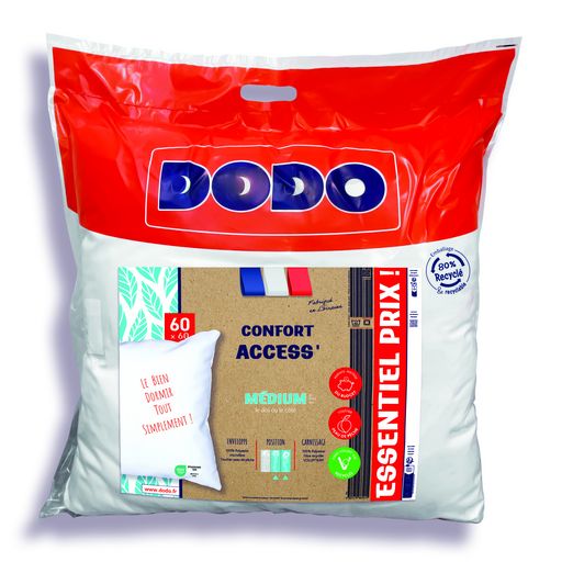 Oreiller DODO Médium CONFORT'ACCESS - ESSENTIEL PRIX ! - Coloris : Blanc - Enveloppe : 100% Polyester Microfibre 83 g/m² - Garnissage : 100% Polyester VOLUPT'AIR - Fibre Creuse Siliconée Certifiée GRS - Poids de Garnissage : 500 g (par Oreiller, 50/70 et 60/60) - Taille : Finie et non Coupée - Housse Polyéthylène 80% Matière Recyclée Bandeau Rouge DODO + 1 Encart (Article Compressé)