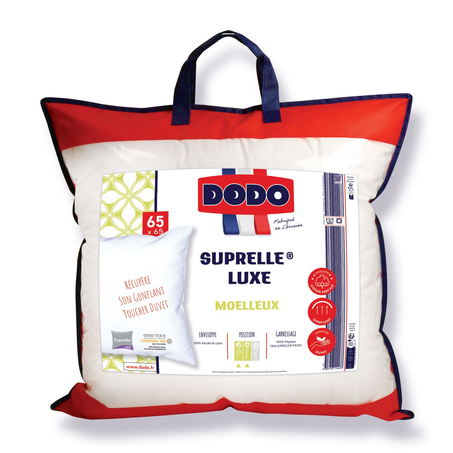 Oreiller DODO Moelleux SUPRELLE LUXE - Coloris : Blanc - Enveloppe : Percale 100% Coton - Garnissage : 100% Polyester SUPRELLE - Microfibre siliconée - Poids de Garnissage : 800 g - Housse PEVA/Intissé de Coloris Rouge à Poignée avec Zip + 1 Encart