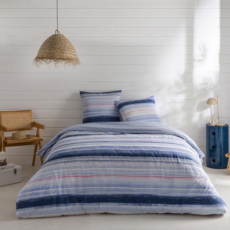 Découvrez notre élégant pack literie, comprenant une magnifique housse de couette et une à deux taies d'oreiller assorties selon la taille. L'imprimé linéaire, avec ses nuances variées de bleu rehaussées d'une touche subtile de rouge, crée une atmosphère artistique évoquant des lignes floues telles des traits de peinture. La face réversible présente un motif de croisillons blancs sur un fond bleu clair, ajoutant une dimension supplémentaire à votre décor.