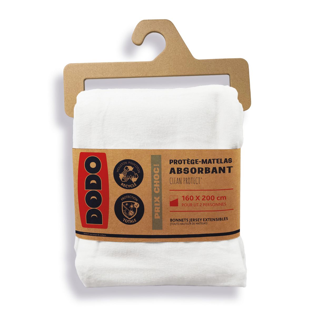 Protège-Matelas DODO Molleton Absorbant Recyclé Triple Protection CLEAN PROTECT' - PRIX CHOC ! - Coloris : Blanc - Composition : Molleton Gratté 2 Faces 50% Coton Recyclé - 50% Polyester Recyclé Traité Anti-Acariens, Antibactérien, Anti-Odeurs - Densité : 160 g/m² - Confection : Forme Drap Housse - Bonnets Extensibles 100% Polyester Jersey pour une Adaptabilité Maximale