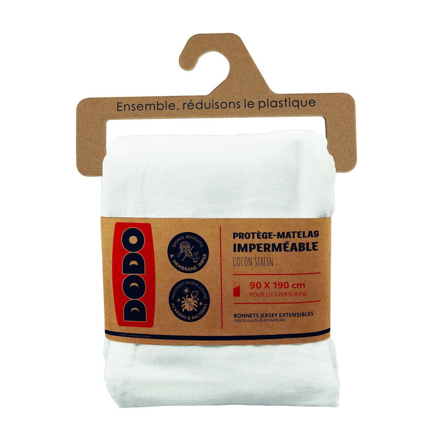 PROTÈGE-MATELAS DODO IMPERMÉABLE COCON SEREIN - COLORIS : BLANC - COMPOSITION DESSUS : ÉPONGE BOUCLETTE 80% LYOCELL - 20% POLYESTER TRAITÉE ANTI-ACARIENS ET ANTIBACTÉRIEN - AUX ACTIFS D'ORIGINE VÉGÉTALE - COMPOSITION DESSOUS : MEMBRANE 100% POLYURÉTHANE - DENSITÉ : 180 G/M² - FINITION : FORME DRAP HOUSSE AVEC BONNETS JERSEY EXTENSIBLE 100% POLYESTER POUR UNE ADAPTABILITÉ MAXI (EXTENSIBLE JUSQU'À 42 CM) - PACKAGING : NU D'EMBALLAGE AVEC CINTRE PACKBORDABLE + 1 ENCART BANDEAU