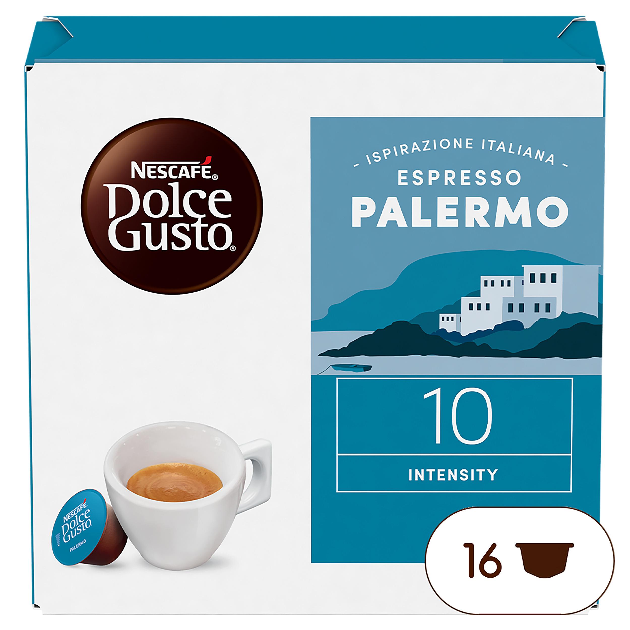 Découvrez la capsule café Espresso Palermo NESCAFE Dolce Gusto. Cet espresso intense et onctueux se distingue par son corps riche et sa crema généreuse. Succombez à ses arômes intenses et persistants, aux notes de poivre et de chocolat noir, typiques d'un café du nord de la Sicile. Intensité 10.