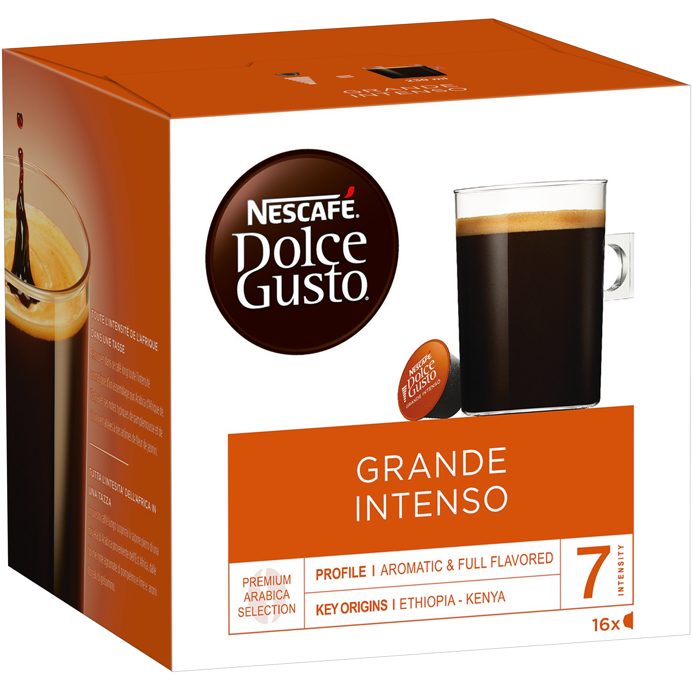 Café torréfié moulu Découvrez Grande Intenso NESCAFE Dolce Gusto, un café 100 % Arabica avec une intensité de 9. Nos créateurs de café ont mélangé des grains de café Arabica d’Amérique du Sud et d’Afrique de l’Est et ont spécifiquement ajusté la mouture pour créer la saveur riche et le corps puissant de Grande Intense NESCAFE Dolce Gusto. Servi allongé (230ml), il révèle des arômes de café torréfié, des notes fruitées et un corps puissant.Grâce à nos capsules hermétiquement scellées qui préservent la fraîcheur du café, vous apprécierez une richesse aromatique incomparable à chaque tasse.