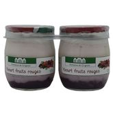 Ingrédients : LAIT entier, Préparation bio fruits rouges (15%) (fruits rouges, sucre de canne, agar-agar), Sucre, Lait écrémé en poudre, Ferments lactiques du yaourt.