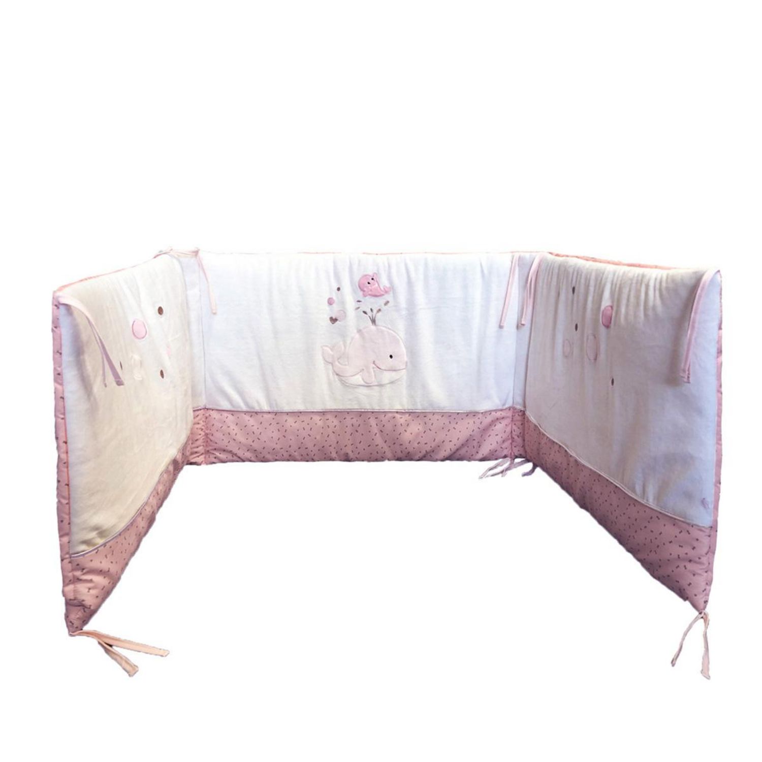 Thème aux tons rosés, chaud et doux, décorée d'une baleine et de son bébé. Ce tour de lit DOMIVA est composé de 3 panneaux pour une dimension totale de 40X180 cm. Doté de soufflets, il s'adapte sur un lit bébé 60x120 et 70x140 cm, Avec ce tour de lit , bébé se sentira bien entouré et paré pour de j