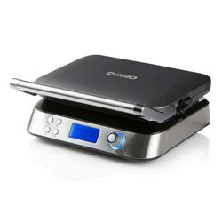 Domo DO9219W Gaufrier WAFFLE GENIUS Domo DO9219W élégante finition en inox. Cuisez parfaitement tous les types de gaufres grâce aux programmes automatiques. Doté de 5 programmes automatiques : « Brussels », « Belgian », « Breakfast/Healthy », « Liège » + 1 programme personnalisé « Custom ». 7 degrés de cuisson à régler individuellement. Fonctionnement intelligent : programmes automatiques avec temps pré-enregistrés, décompte durant le cycle de cuisson (minuterie) , indique lorsque les gaufres sont cuites (signal de fin). Plaques de cuisson avec revêtement antiadhésif de haute qualité qui permet de cuire 2 gaufres selon une empreinte de 5 x 5. Avec safety lock pour faciliter les déplacements. Cool touch et dispositifs de sécurité intégrés. Couvercle flottant qui s?adapte automatiquement au contenu, pour une cuisson optimale des pâtes levées. Plaques de cuisson sophistiquées uniques avec un débordement (no spill) et une épaisseur idéale pour une gaufre aérée, croustillante et uniforme. Résultats de cuisson rapides grâce à la puissance élevée de 1600 W et au double élément chauffant. Panneau de commande simple avec écran LCD éclairé en bleu.