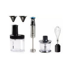 Avec 4 accessoires : mixeur à soupe, fouet, hachoir et couteau à spirale.