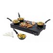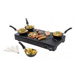 Domo DO8712W Set mini woks, crêpière et gril Gourmet-set Domo DO8712W adapté pour 4 personnes. 3 en 1 : wok, plaque de cuisson à crêpes et grill. Doté de 4 poêlons wok avec revêtement anti-adhésif et 4 spatules en bois pour cuisiner de façon conviviale. Thermostat réglable avec des lampes témoin. Plaque de cuisson avec revêtement anti-adhésif de haute qualité. Peut s?utiliser sans les poêlons wok pour réaliser de petites crêpes. Facile à nettoyer. Louche à pâte incluse.