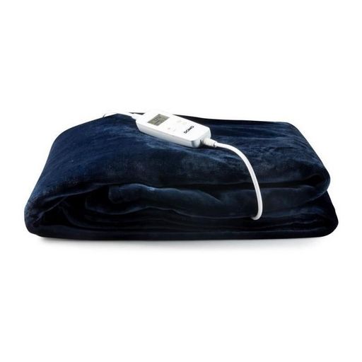 SURCOUVERTURE CHAUFFANTE ELECTRIQUE 10 réglages possibles. Minuterie jusqu'a 10 heures. Chauffage rapide (160W). Câble électrique amovible - facilement lavable a la main. Matériau: molleton de flanelle pour plus de confort et douceur. Protection contre la surchauffe. Couleur: bleu marine foncé. Dimensions: 1