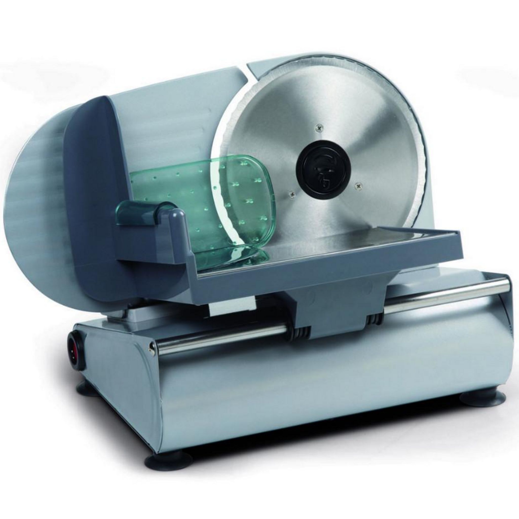 Domo DO521S Trancheuse électrique Domo DO521S dotée d'une lame en acier inoxydable légèrement dentée pourtrancher du pain, de la viande, du fromage,... Très stable avec 4 pieds en caoutchouc.