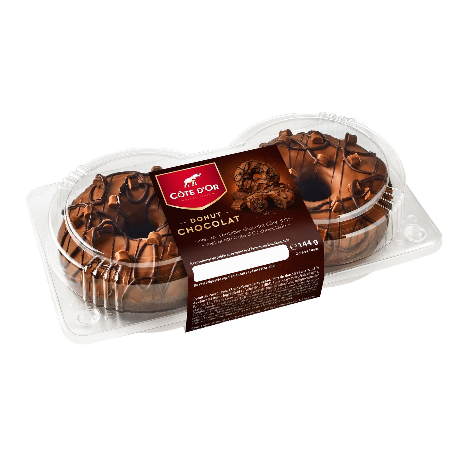 Délicieux donut Cote d'Or au cacao généreusement fourré avec un fourrage au cacao, et décoré de chocolat au lait et de chocolat noir Cote d'Or