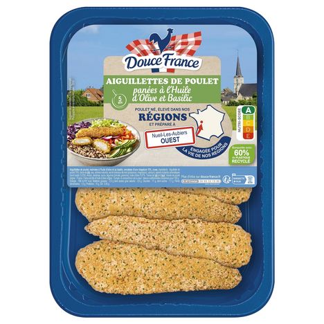 Ingrédients : Aiguillette de poulet 78%, farine de blé, eau, arômes naturels, sel et minéraux de mer (potassium, magnésium, calcium), épices et plantes aromatiques (dont basilic 0,03%), levure, dextrose, sucre, légumes (tomate, poivrons), huile d'olive 0,07%. Traces de lait et d'œuf. Viande de poulet origine : France